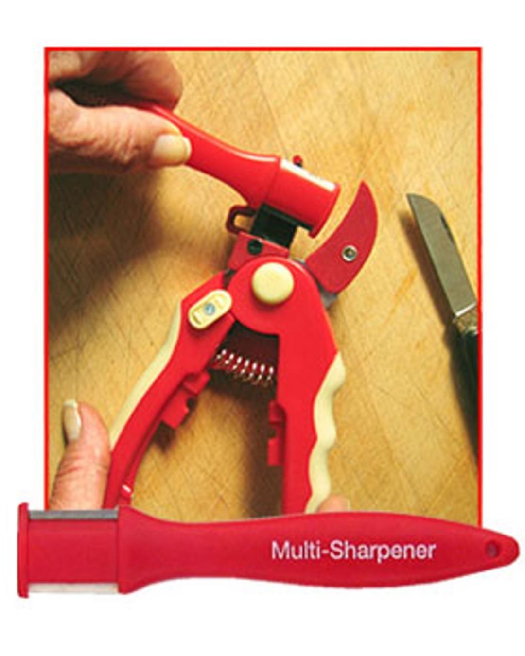 The easiest way to keep your tools sharp! This compact sharpener, (under 5" long), will sharpen pruning shears, loppers, knives, grass hooks and more. A must have tool! Keep those pruners sharp!